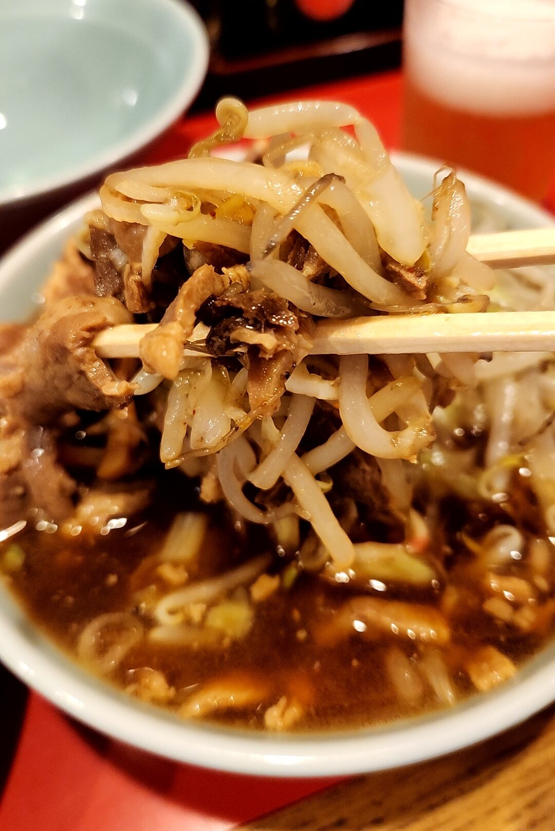つけダレの甘味・辛味・酸味をしっかり混ぜて、野菜やチャシュー(挽肉状)を頬張る。これが酒と楽しめる日が来るとは・・・刻んだナルトやネギも大量に加わります