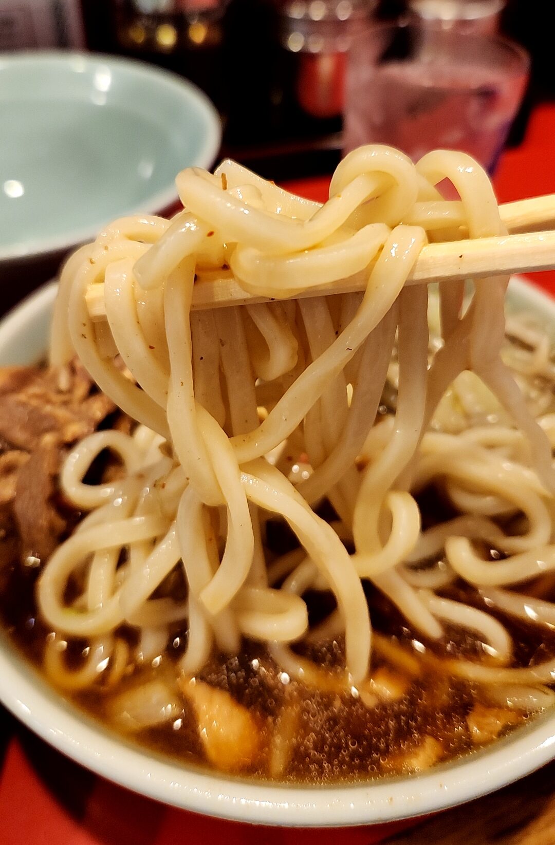 具が減ったらやっと麺投入。麺の食感とこの強い味わいのつけダレ、無条件に美味い!