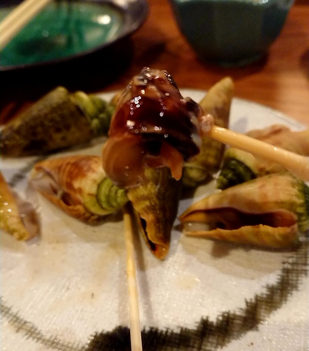 黒塗りの渋い建物。16時開店だが早めに入れてくれてありがたい。清潔な店内で、木のカウンターが良い。ここは地元の魚料理がメイン(肉料理もあるようです)、まずはつまむならおでんに加え、貝類が良い。クロベやツメバイなど、まず東京などではお目にかかれない食材たち。ナギサビールで喉を濡らしたら、地酒の「長久」をお燗で(ここからは「長久」が止まらなくなります…)ウツボは香ばしく炙ったら甘めの砂糖醤油で頂く。