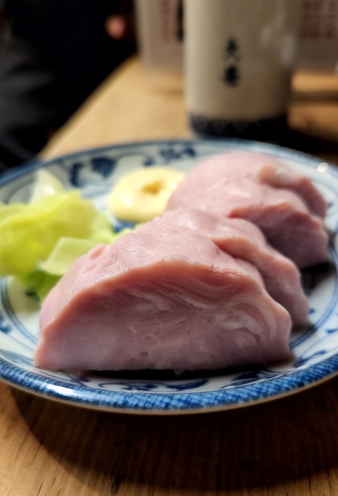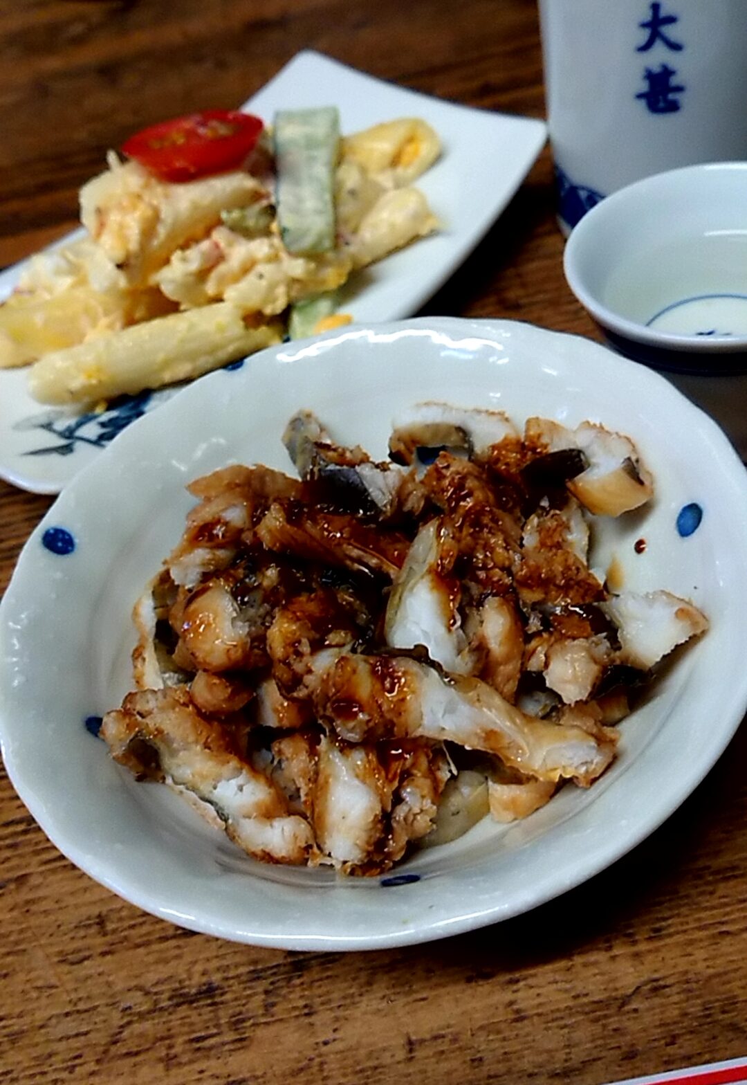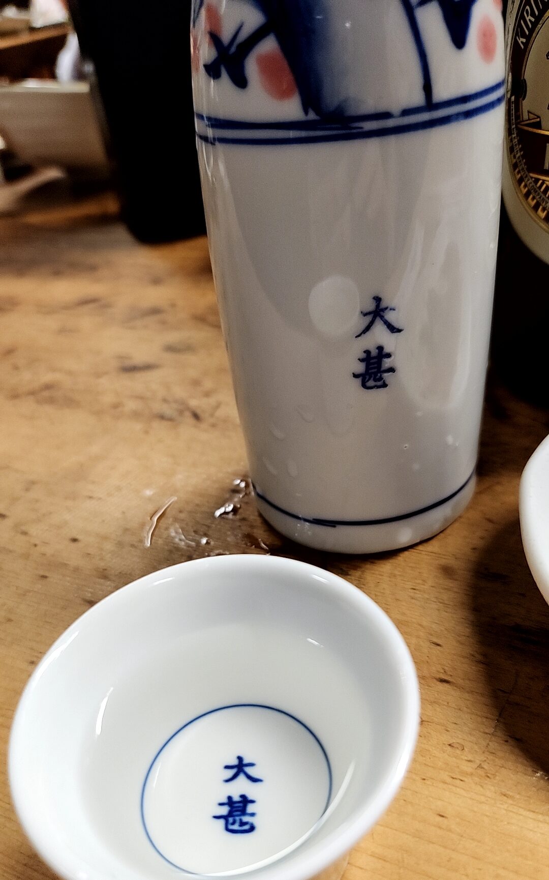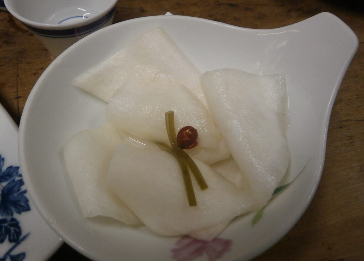 賀茂鶴の燗。大甚といえばこれ。わたしはまずビール大瓶を飲み干してからこちらを頼む。樽の香りがたまらない。昔は2合徳利2本くらい飲めたのだが、いまは「いっしょう」(1合)で十分