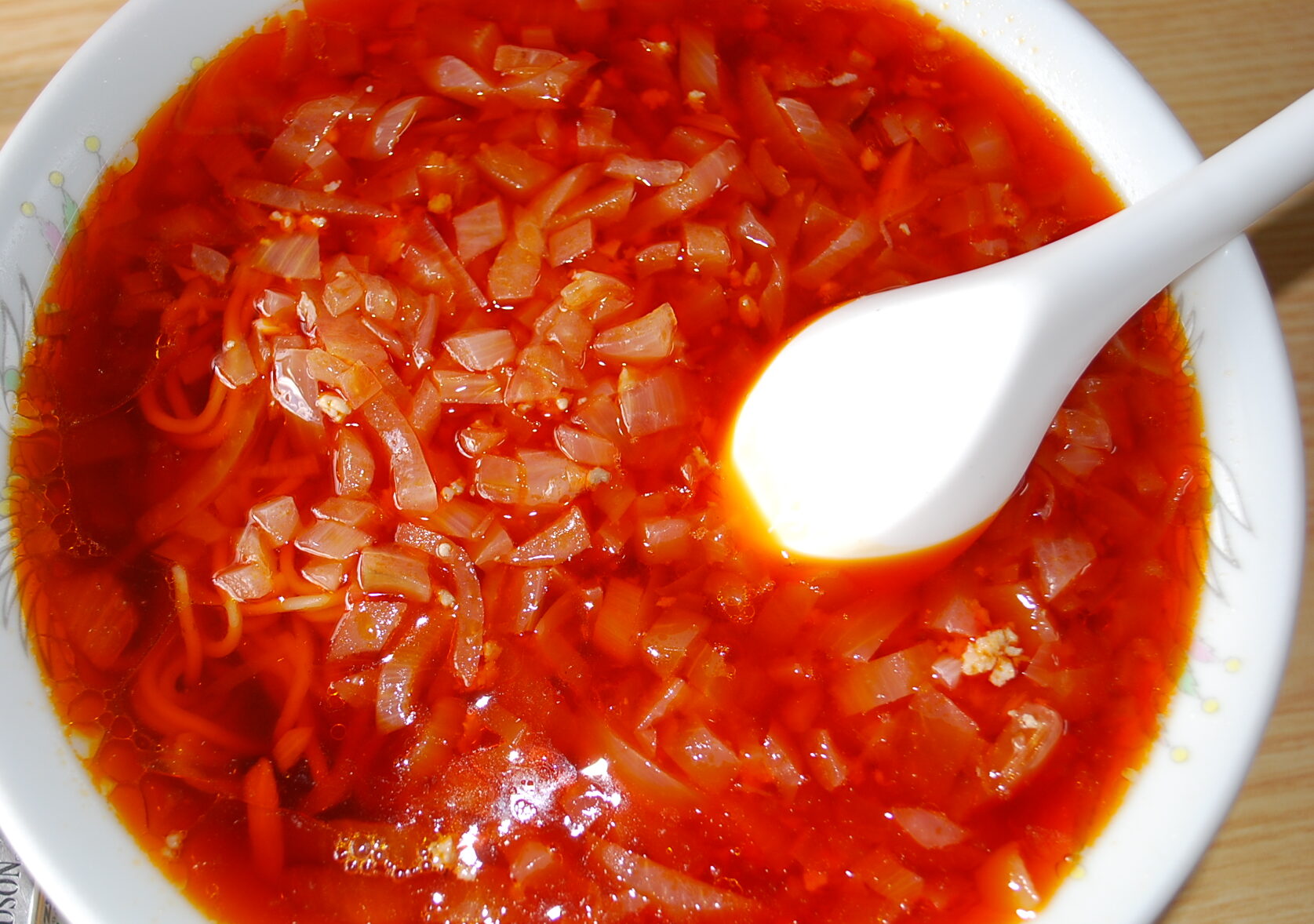 ラー油たっぷりのスープに麺が絡むが、吸い込むのが難しい。たっぷりの玉ねぎと、少量の挽肉が良いバランスを形成している。チャーシューはなく、食べたければチャーシューメンでオーダーとなる