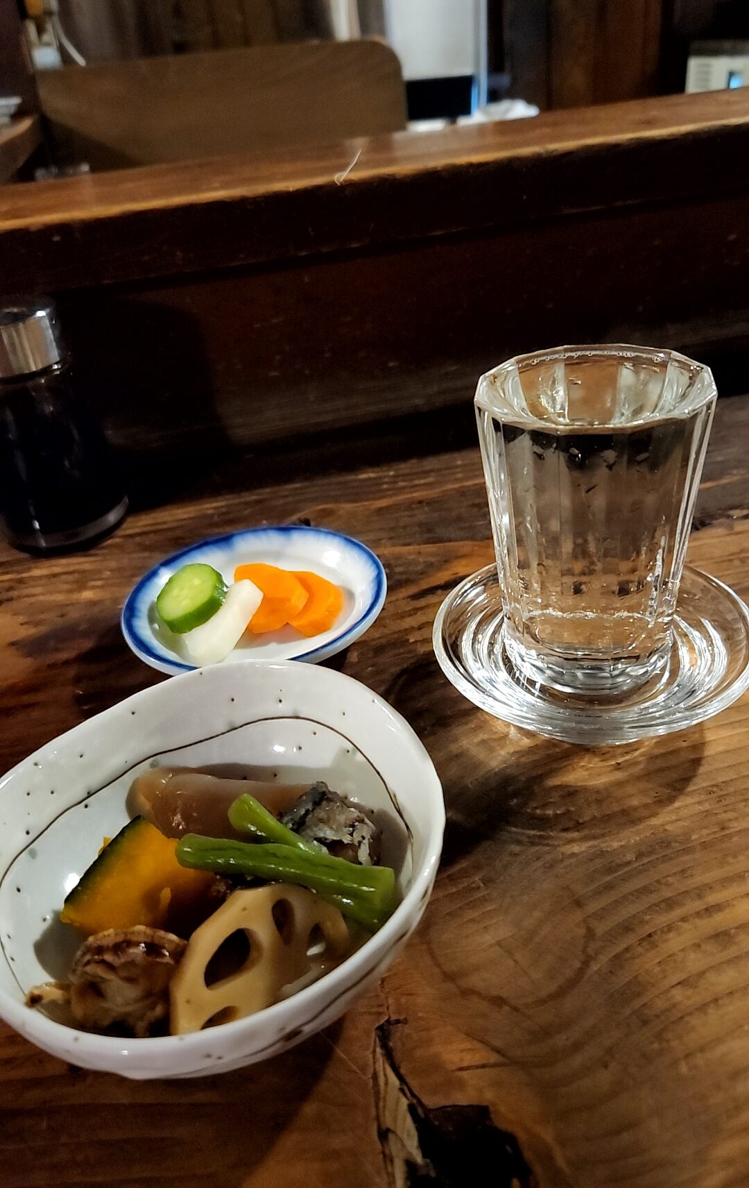 浦霞の燗酒。お新香と、野菜の煮物がこの日はじめのおつまみ