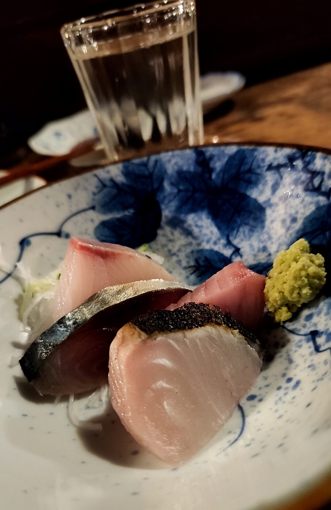 高清水辛口の燗。アテ3番手は刺身、この日は鰆・鯖・まぐろ・ブリ。過去に頂いた他のアテではふき味噌・海苔の佃煮なんかも美味かった