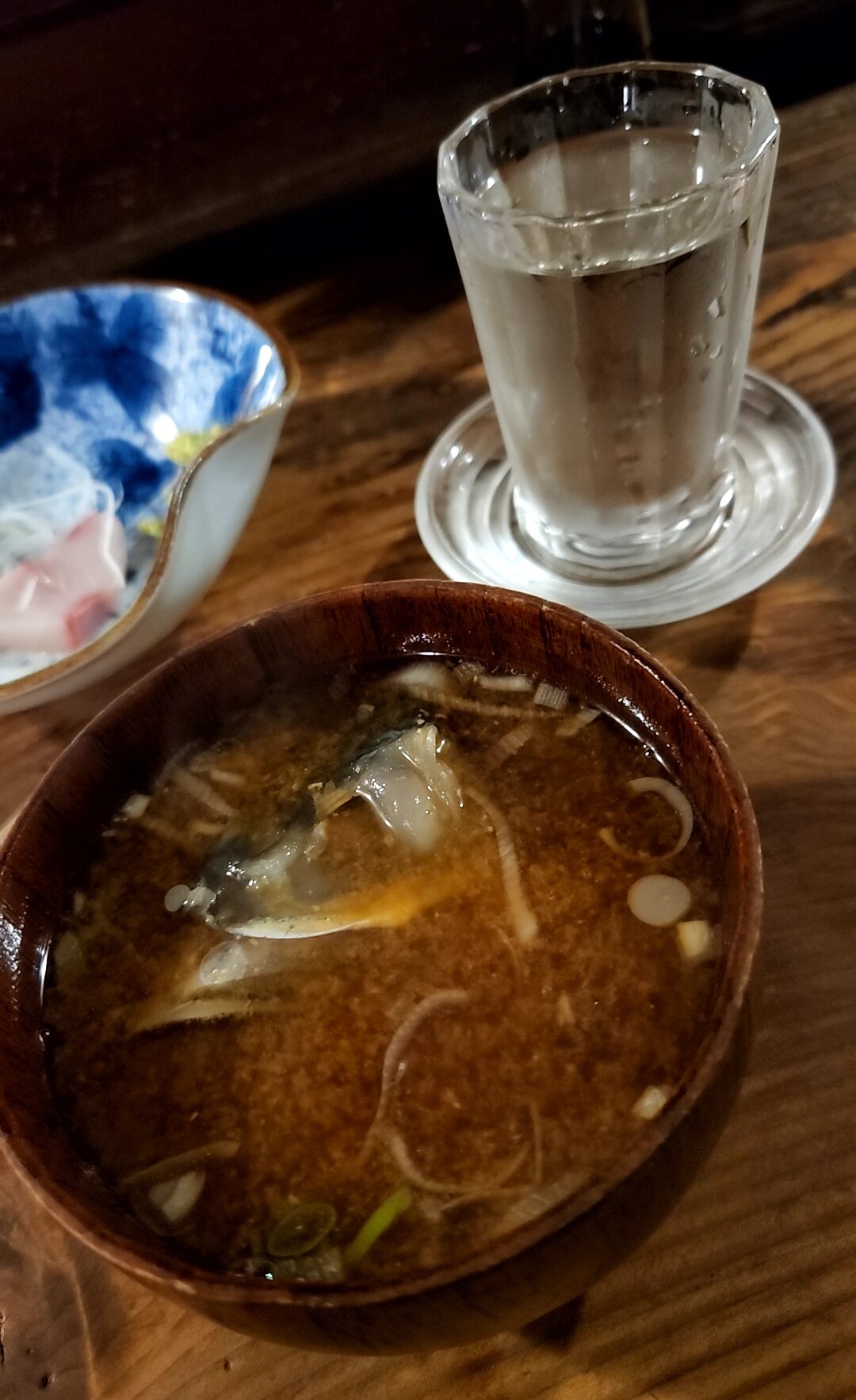 ラスト4杯目は高清水初しぼり。この店では4杯までしか飲めない。最後はおでんが出ることもある。この時は味噌汁で。胃袋をやさしく包み込む、と言いたいがこれも又アテになる・・・