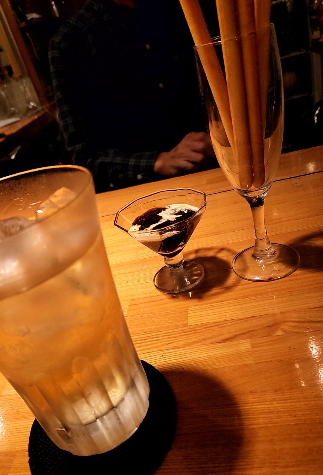 オリジナルのハイボール。自分でブレンドしたというウイスキー。チャームは自家製のカレー、これを巨大なクラッカー(?)にディップして食べるのだがこれまた美味