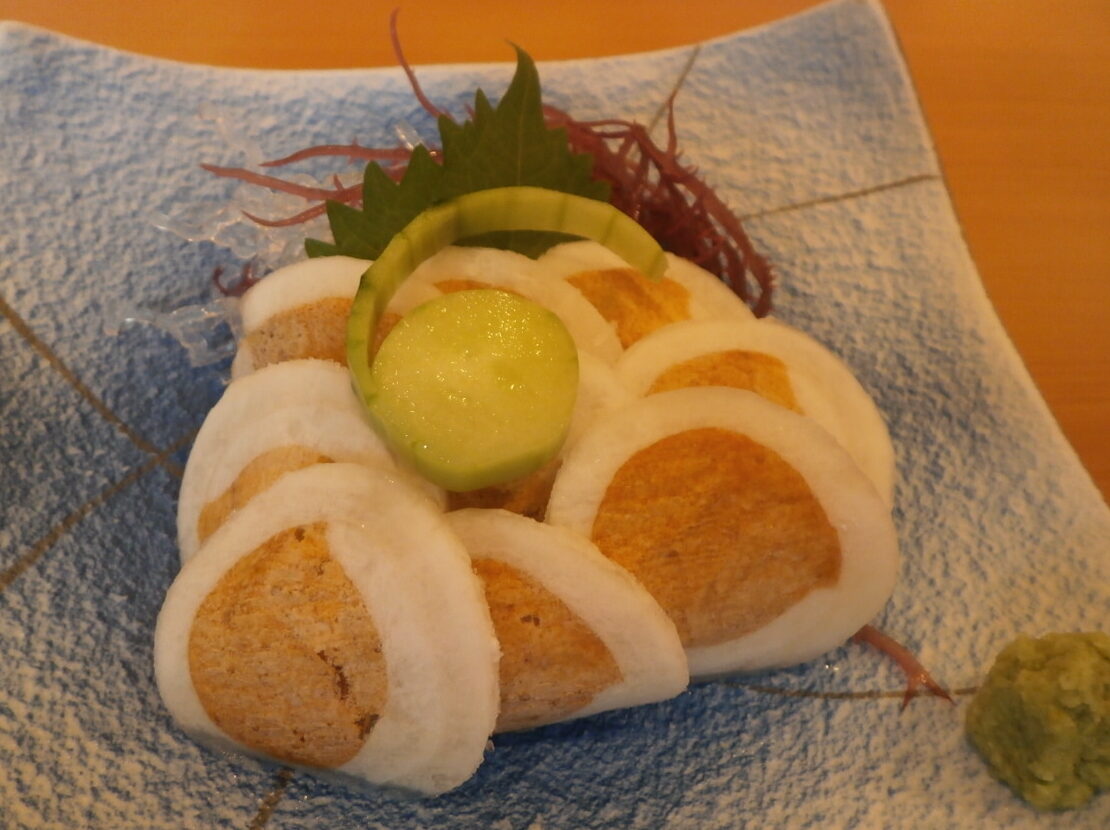 ルイベは凍った状態で提供、ダシ醤油に投入すると程よい食感になる。この通り、丼以外も一品一品質の良い料理だった