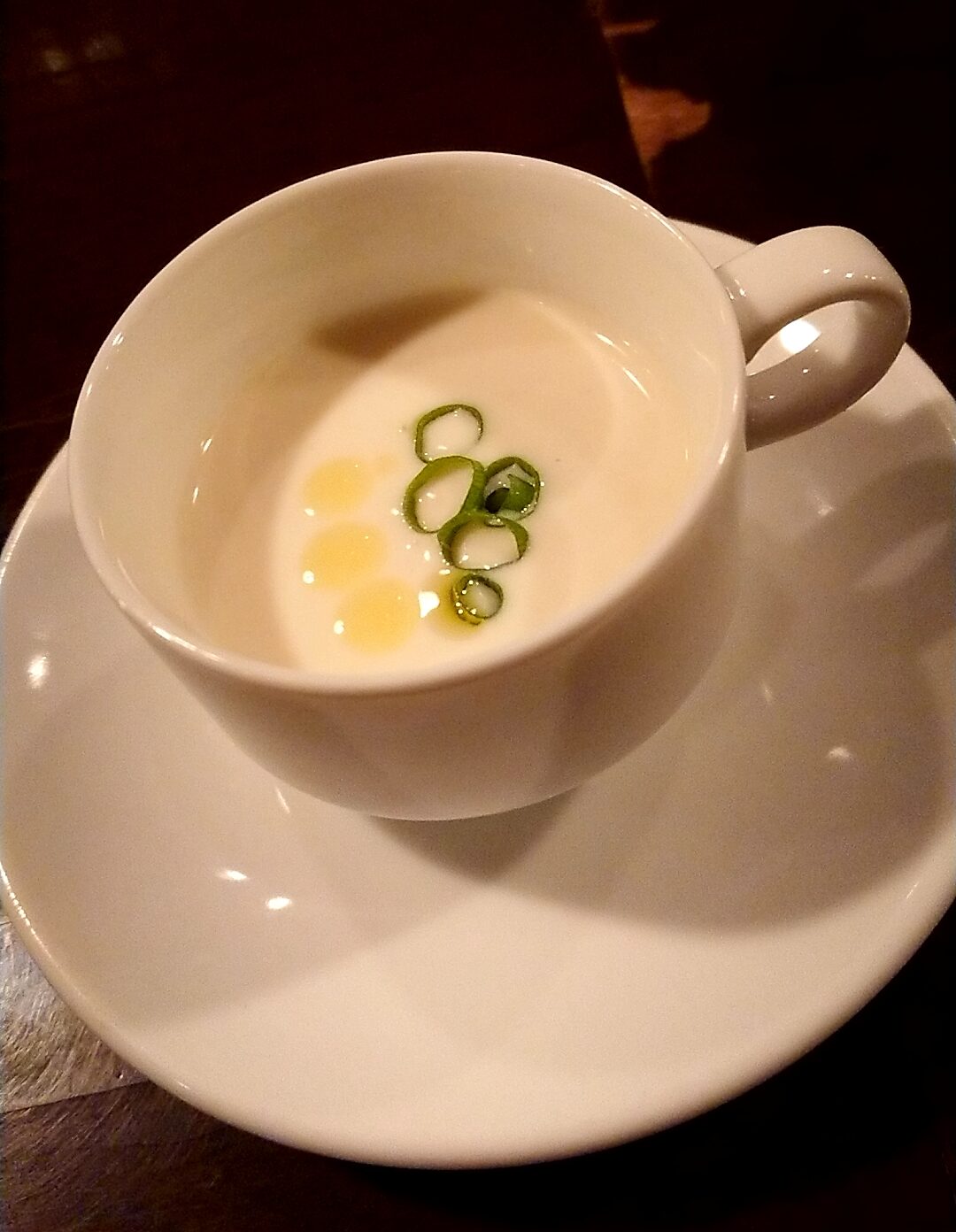 冷静ポタージュスープがチャーム。これを頂いただけで、この店の料理が美味しいことが十分連想できる