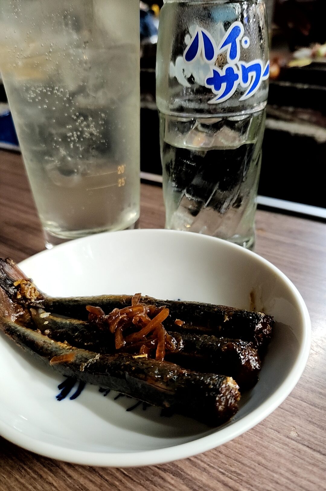 いわし甘露煮。チューハイは焼酎・ハイサワー・氷いずれも別々の料金システム