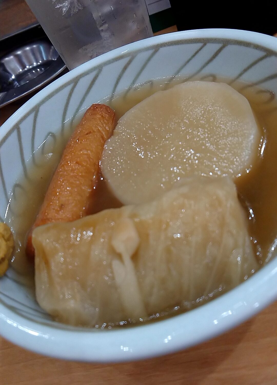 おでんは種類が15種類ほどでしょうか。大根・ごぼ天・ロールキャベツ