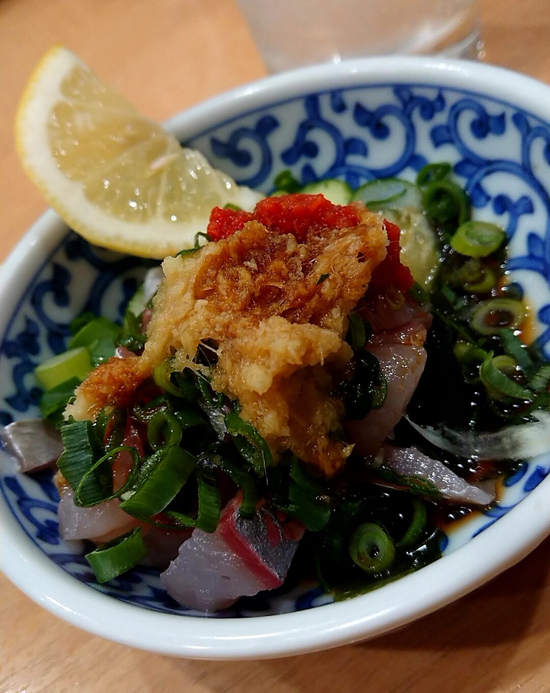 たっぷりのネギや生姜と一緒に食べる、アジのタタキ