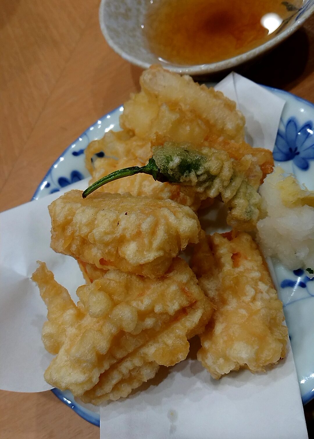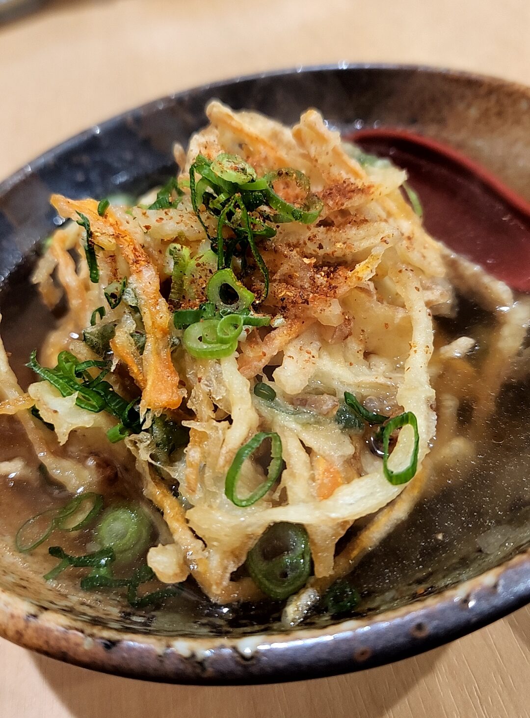 名物、かき揚げ天のダシかけ。ここのおでんダシが味強めで、天ぷらを浸して食べる