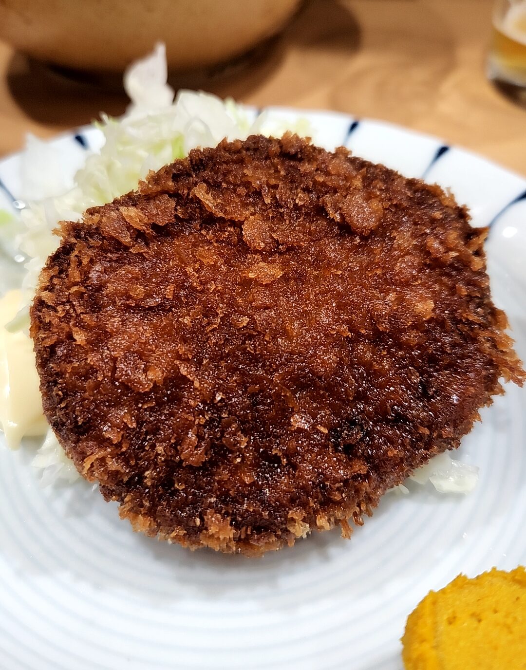 揚げたてを提供してくれるミンチカツ、肉も脂も詰まっている。ソースで