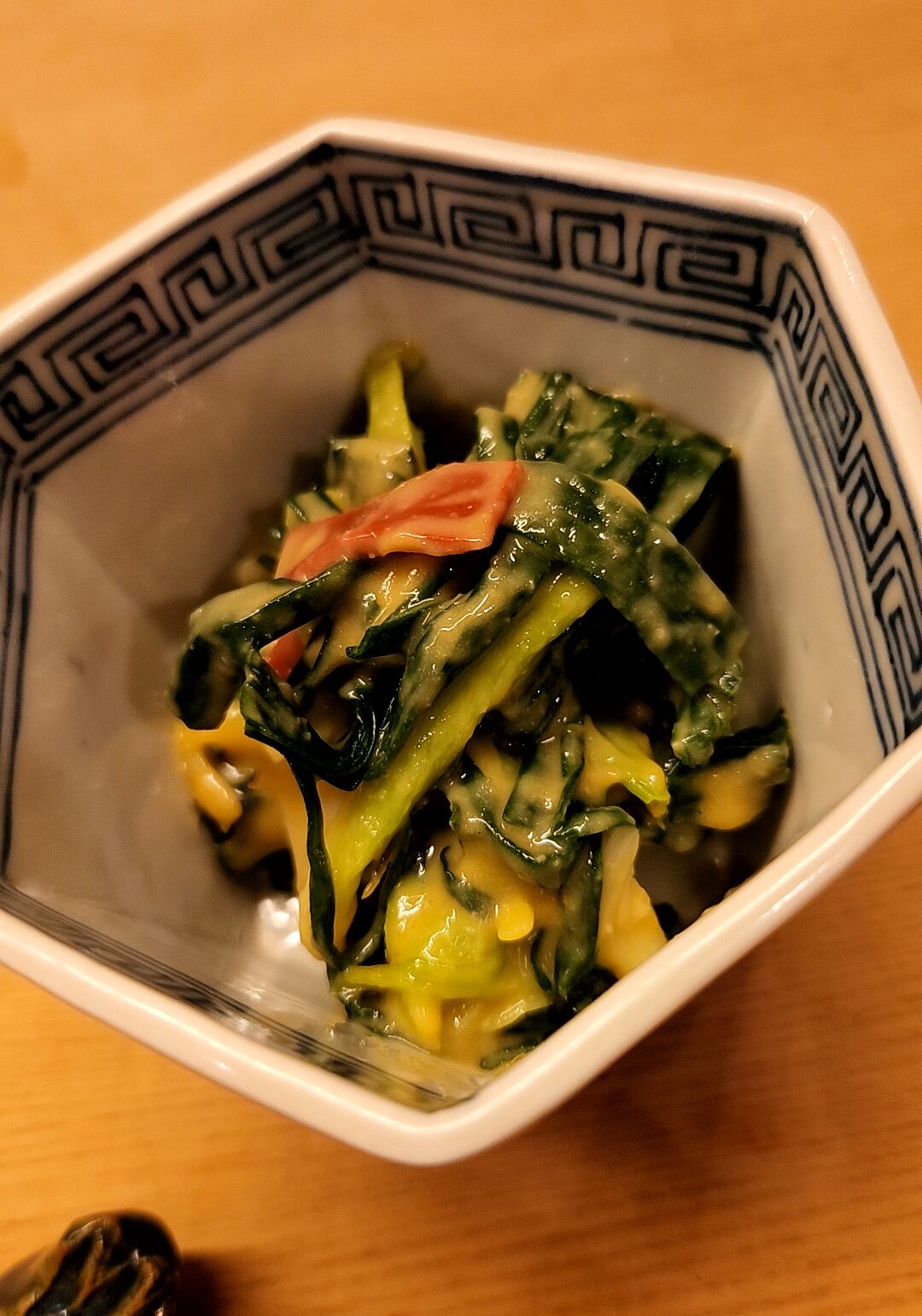 そんな木屋町の中で落ち着く店が「めなみ」。初訪問は在阪時の、その年最後の勤務日の後だった。高級感のある白板のカウンターに身構えたが、実はそこまで高額ではなく、それでいて極めてグレードの高い料理(「おばんざい」ですね)に驚いたものだ。
