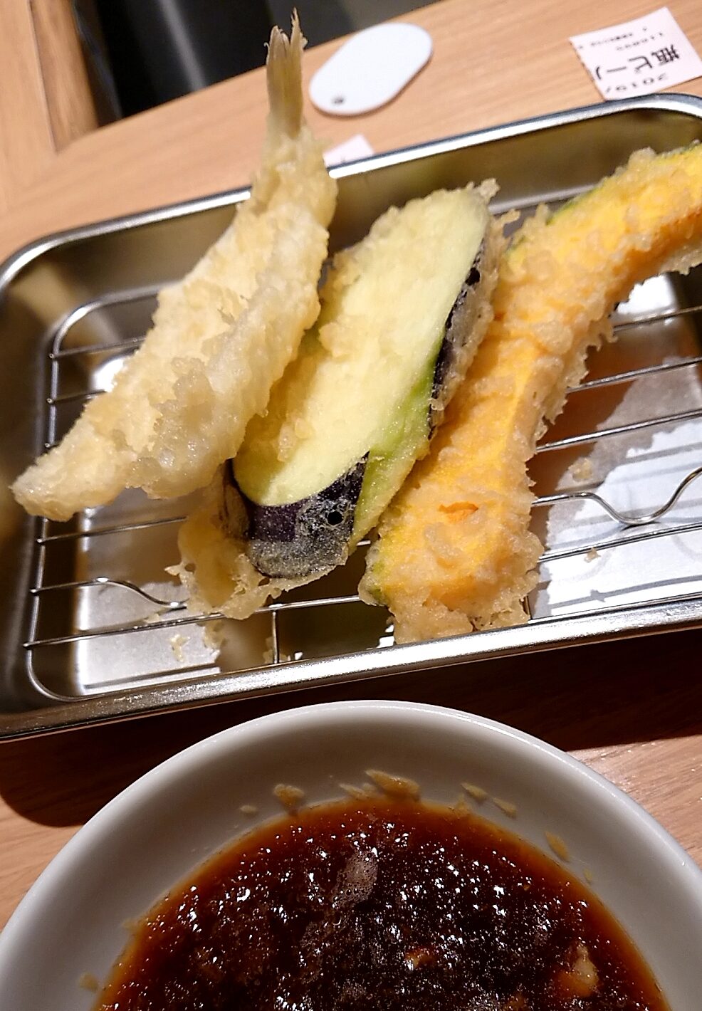 天ぷら定食。基本は、目の前の大根おろし入りの天つゆで頂く。都度、揚げたてを提供してくれるので、言うまでもなくサクサクの食感