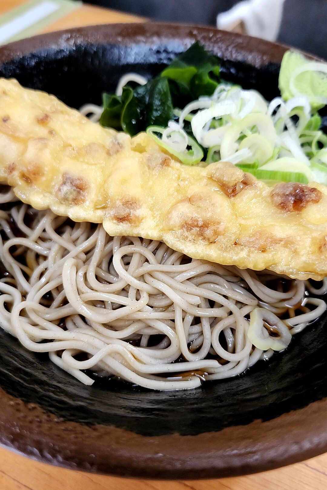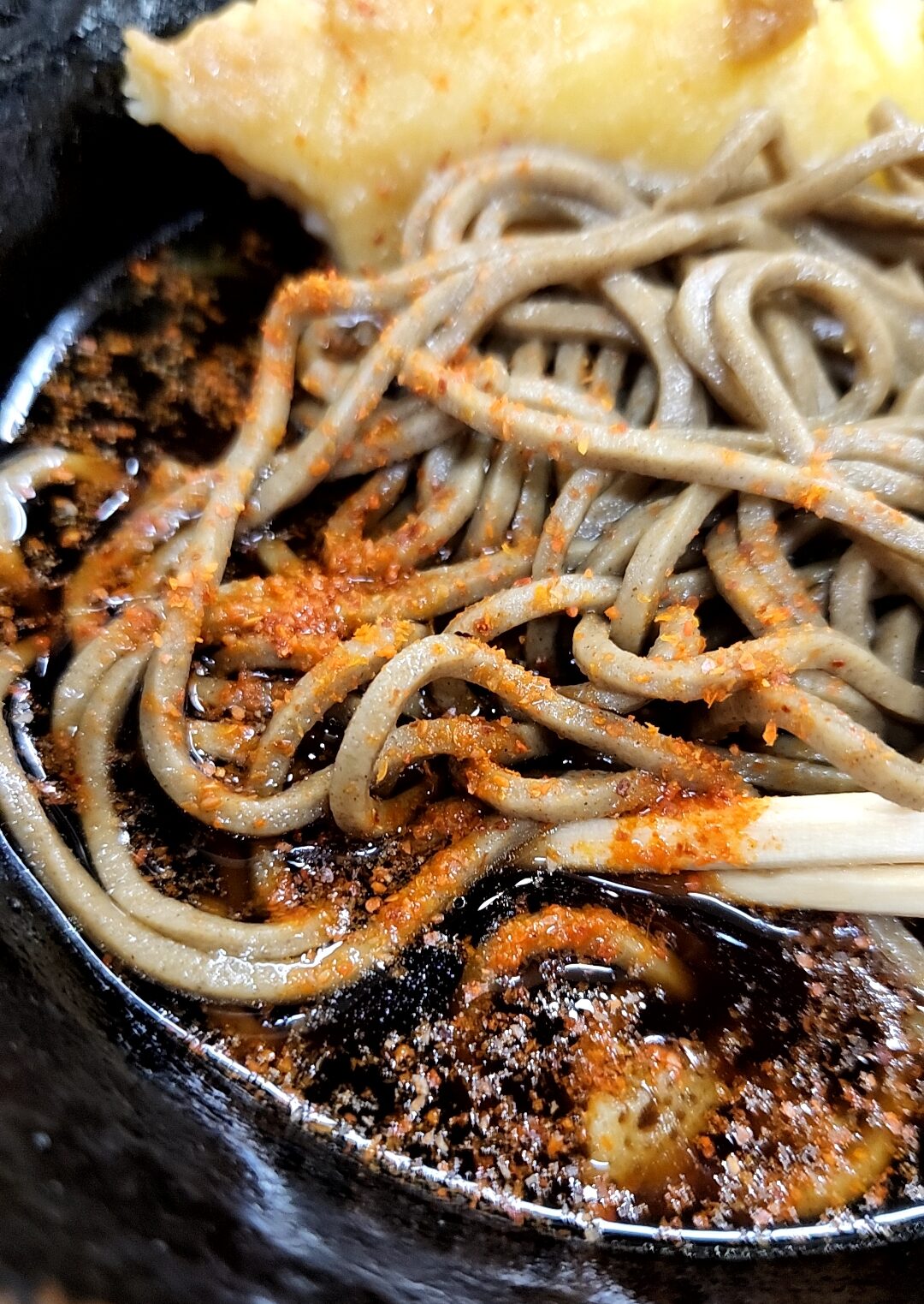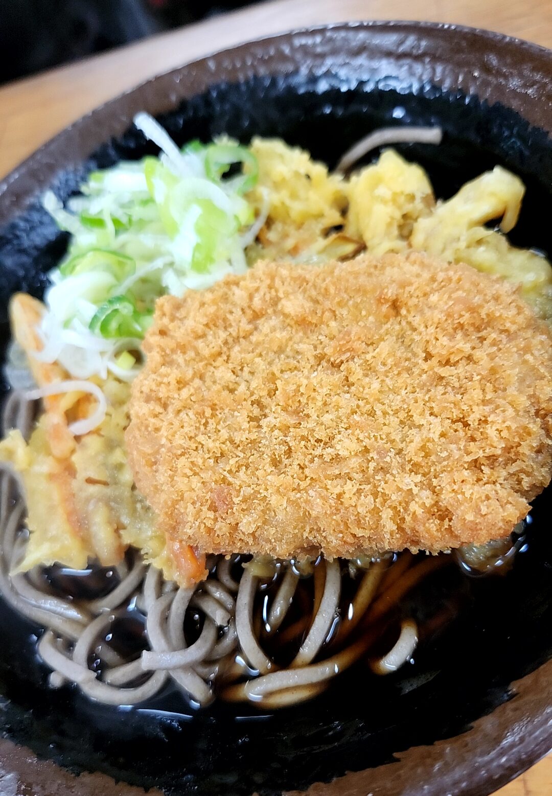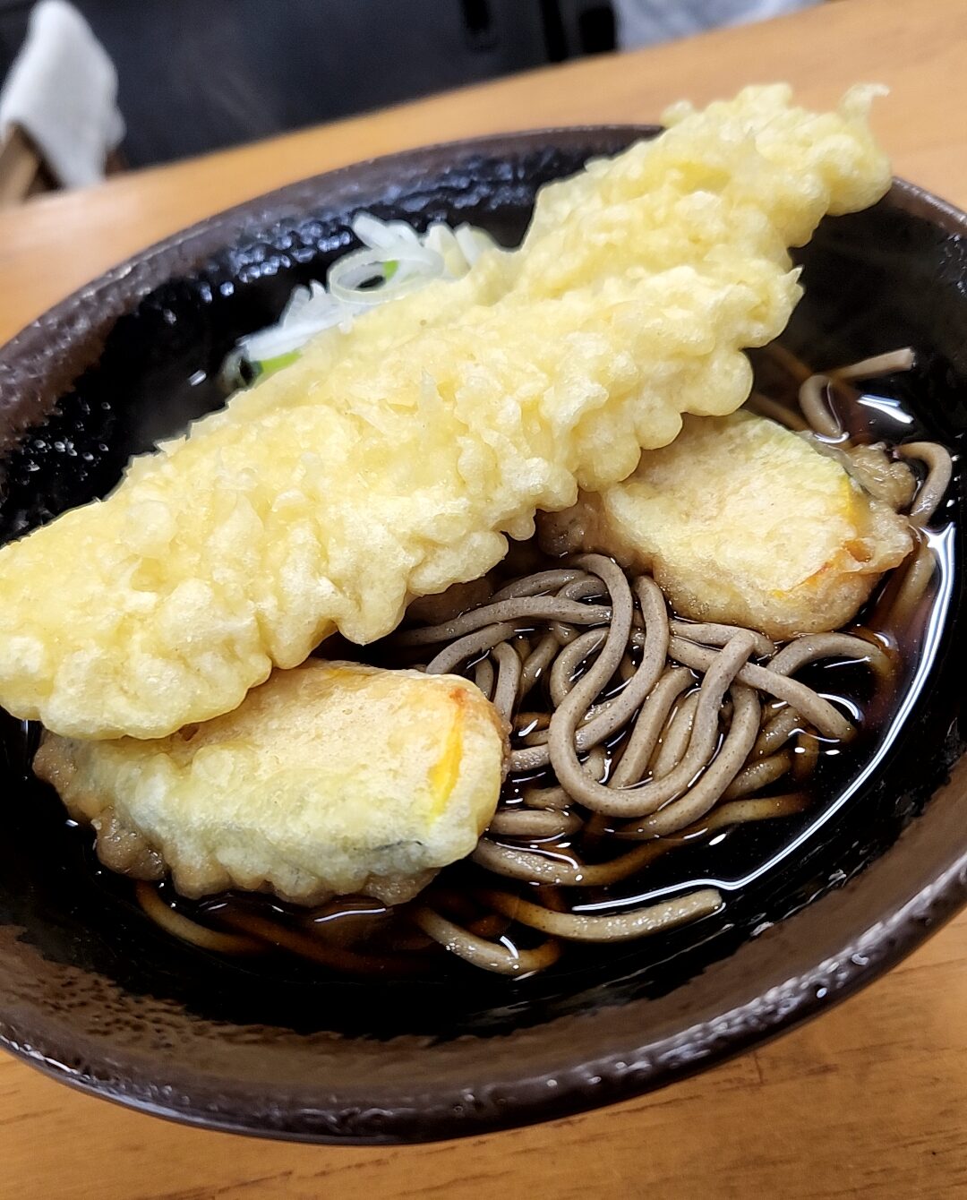 漆黒などと称される濃い目のそばつゆに、太打ちの蕎麦。後半は一味を入れたりする。青ねぎとの相性も抜群だ