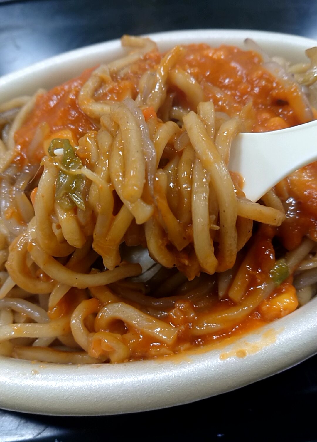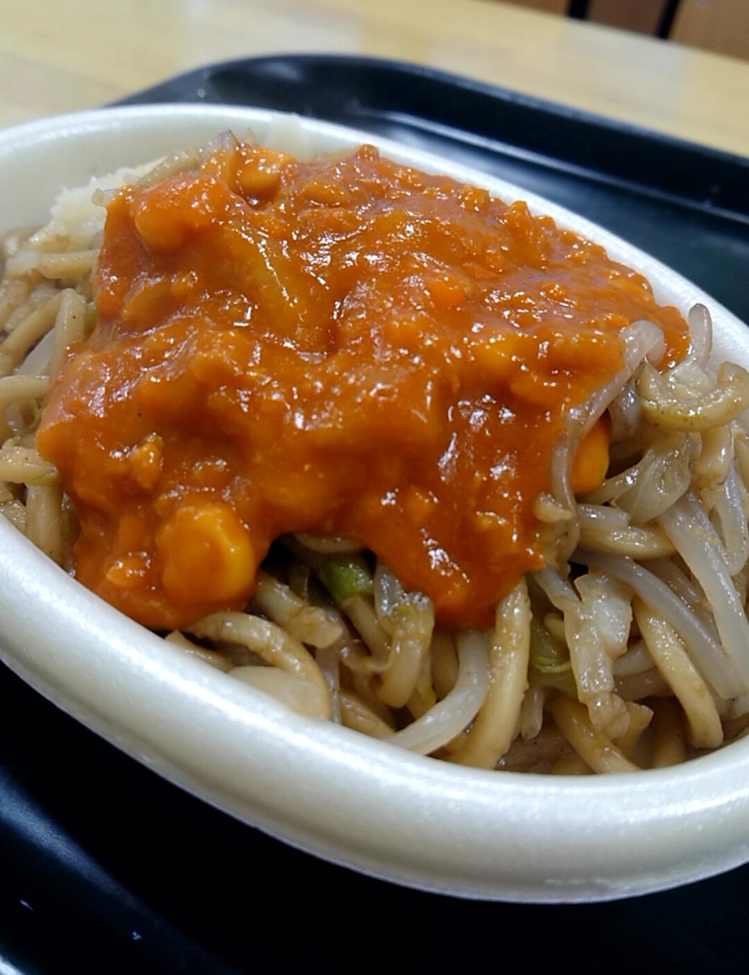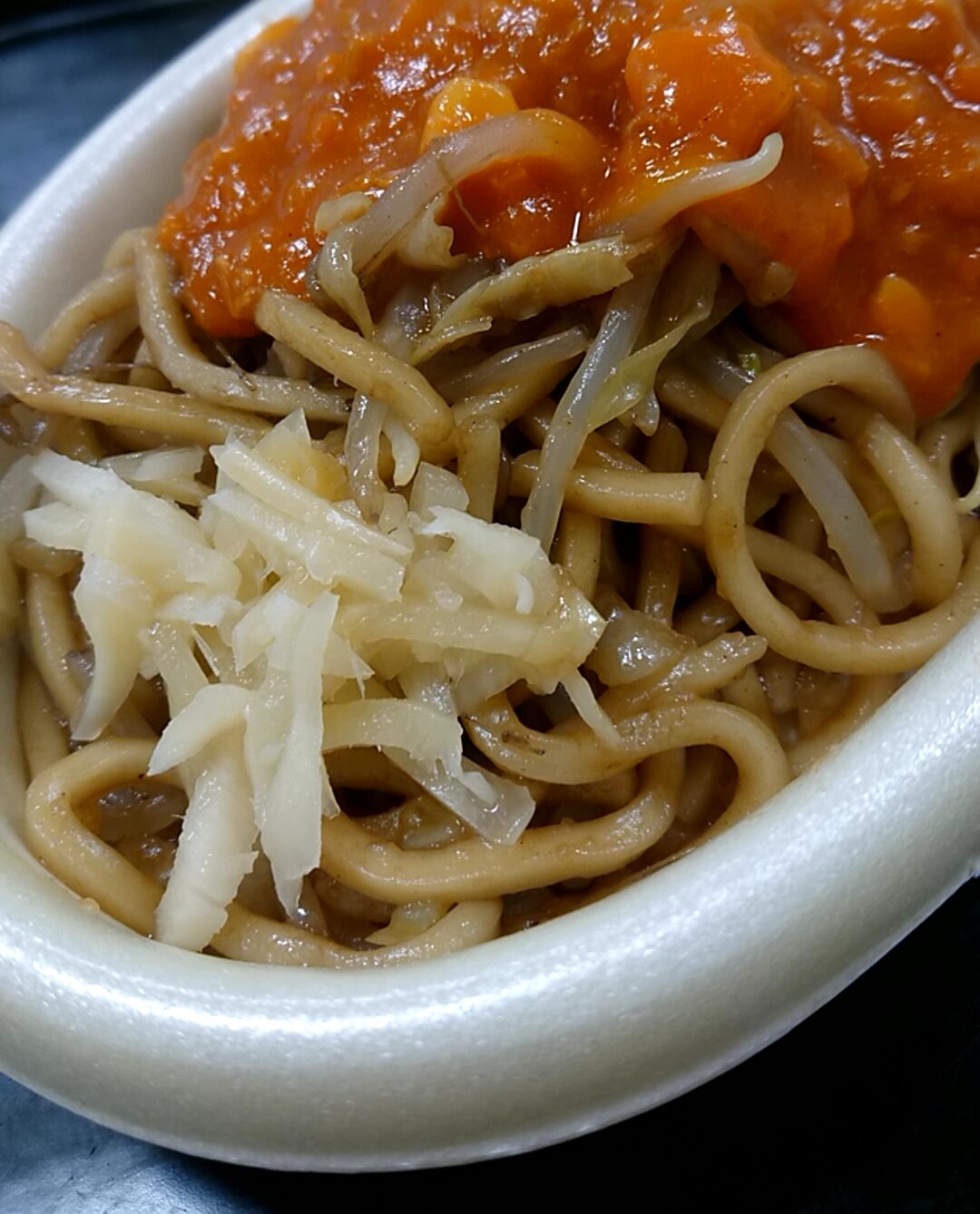 イタリアン。もやし・キャベツと、明らかにパスタとは異なる太麺。それにミートソース