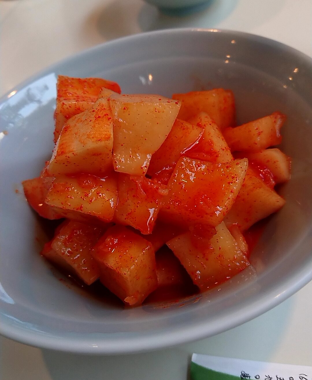 ビールのお供に頼んだカクテキは量が多く、酸味と辛味が程よい美味さ
