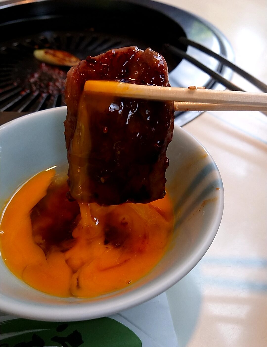 「食道園」では溶き卵で焼肉を頂く。妙に米が欲しくなる美味さ