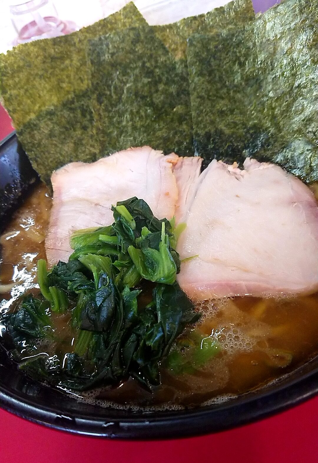 ラーメン普通。チャーシュー・海苔・ほうれん草にブラウンスープ。神々しく見える