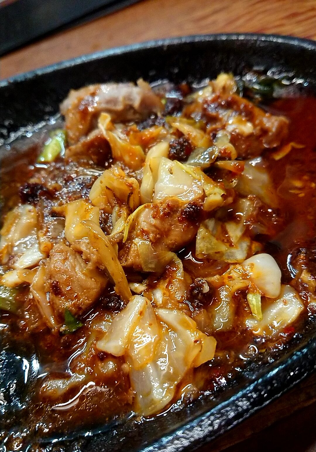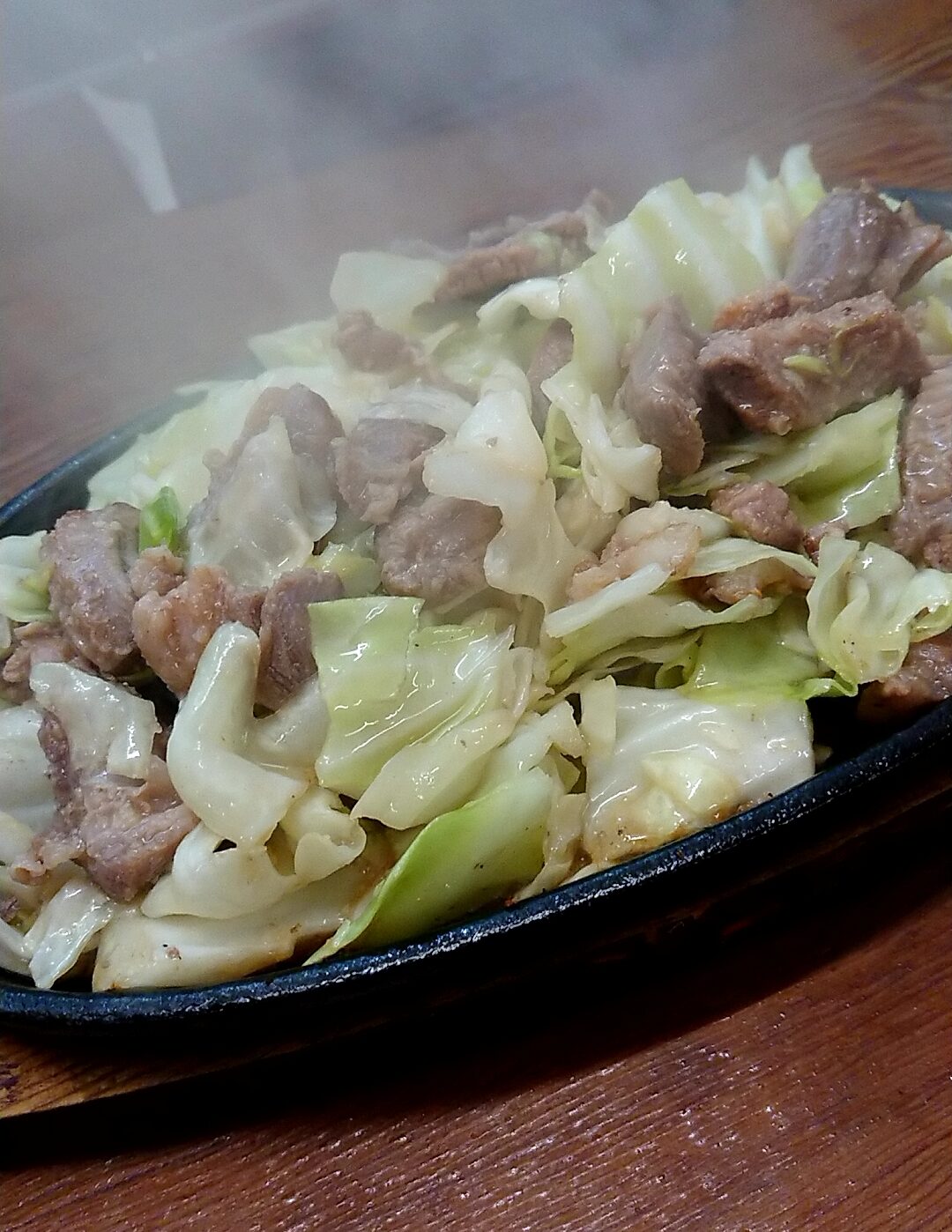 店内に入ると待ち客が何組かいらっしゃった。が、一匹狼かつカウンターが空いていたことを配慮いただき、申し訳ないが先に入れさせてもらった。有難い限りだ。厨房では中華鍋で調理されている焼肉を、我が出番はまだかと大量の鉄板が温められている。それに、ポリ袋に大量に入ったキャベツが圧巻、この店の人気のほどが伺える。