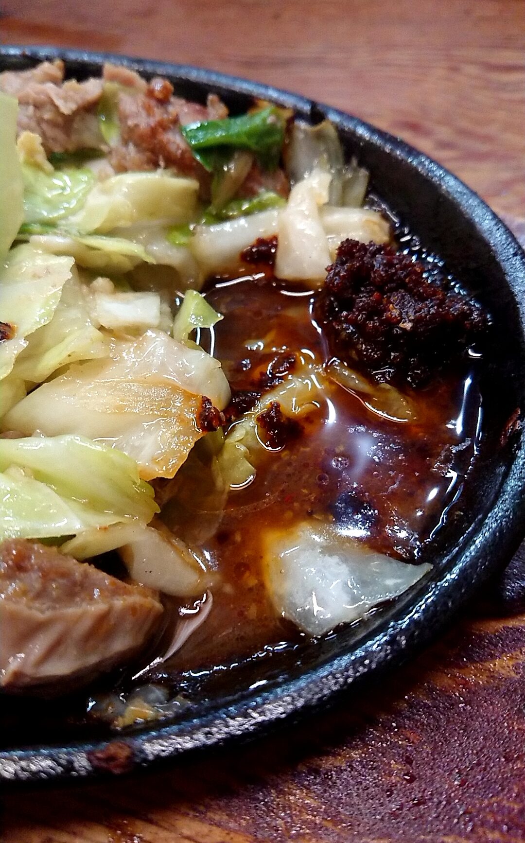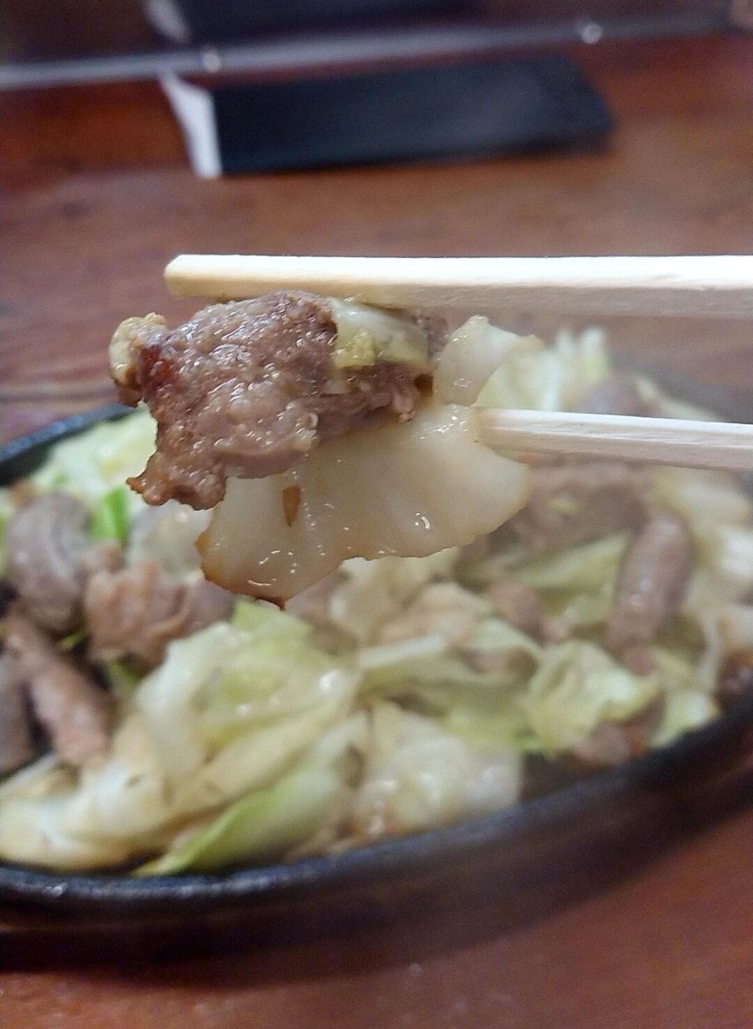 大量のサガリ豚肉とキャベツ。特に肉は一口一口、ハードな食感がたまらない。肉・甘辛のタレと甘いキャベツのミックスを楽しむ