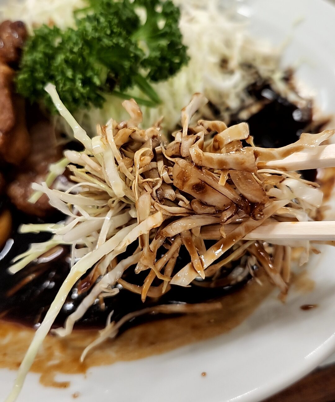 このソースに備え付けのキャベツをシャバシャバにして食べるのは、ヤバいくらい美味い