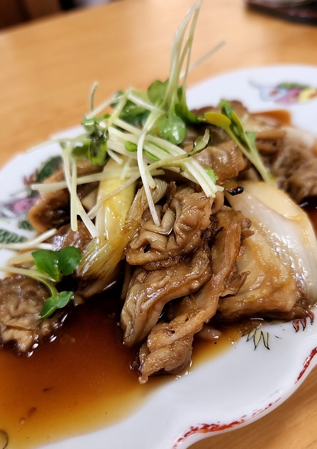 もつ炒めは酒のアテとして注文(漬物のお通しも頂いてます)柔らかいもつ肉に、甘辛のタレ、そしてネギの組み合わせが最高