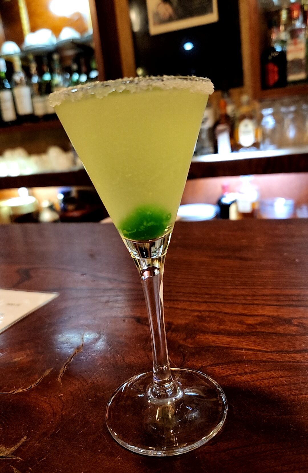 雪国。ウォッカベースのカクテルで、砂糖がまぶしてある。鮮やかさなビジュアル、キュッと飲みやすいカクテル