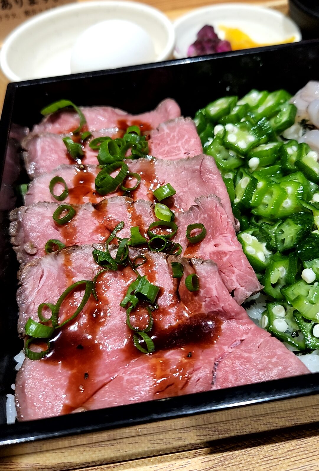 山形牛のローストビーフ。こちらは温泉玉子と一緒に頂きます。中央にはオクラが鎮座