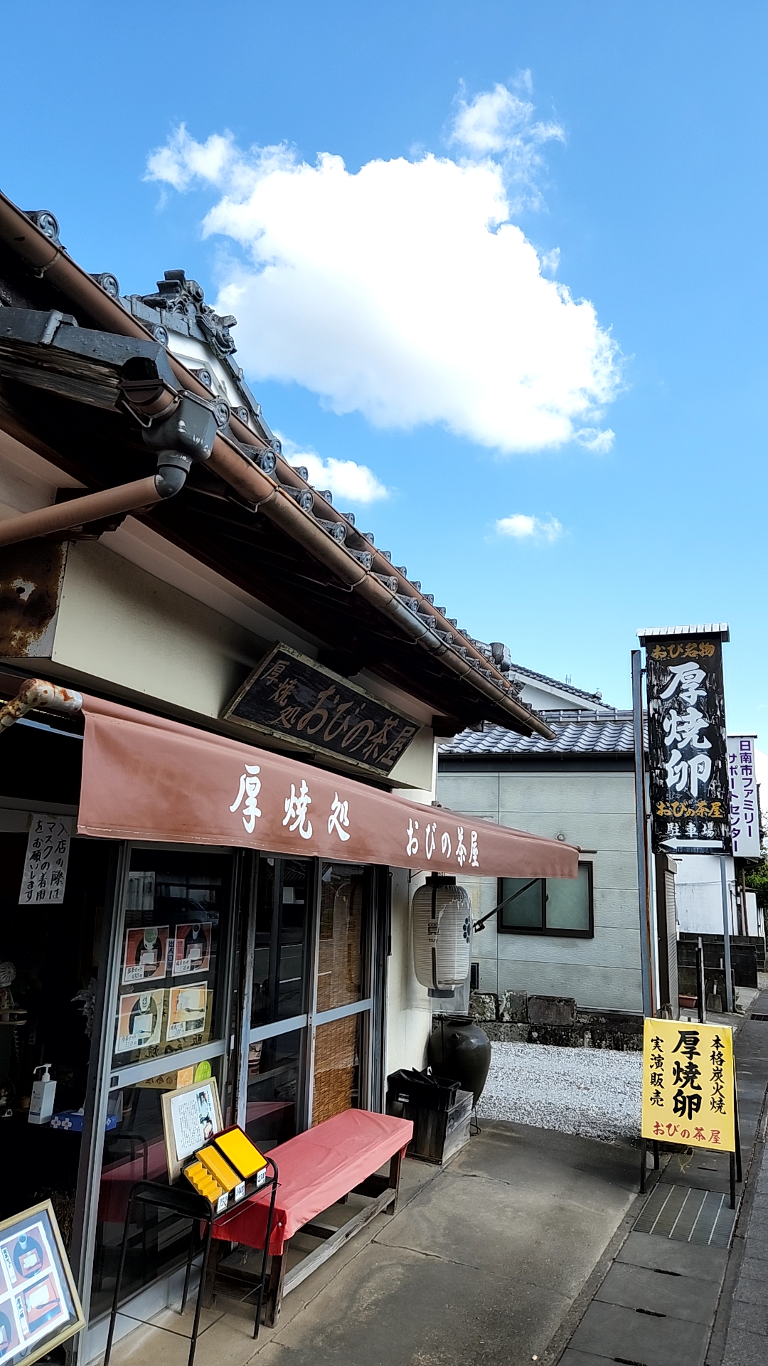 玉子焼きなんて、日本全国どこでも食べられているものだが・・・と思うなかれ。飫肥の厚焼き卵は世間一般のそれと全く異なる。ご飯のおかずや酒のアテではない。これを販売している「おびの茶屋」にお邪魔すると、店先に並ぶ巨大な厚焼き卵をみることができる。