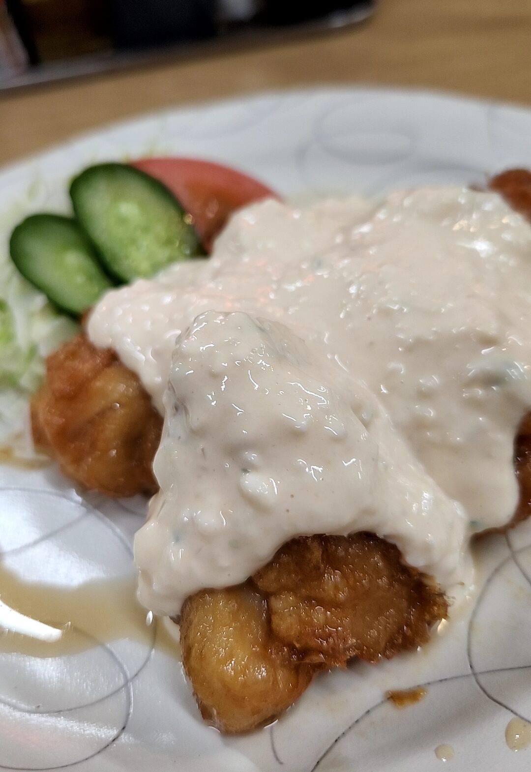 チキン南蛮。実はタルタルありのチキン南蛮を、ここ宮崎で食べたのはこちらが初だった。こんもりと盛られたタルタルソース、南蛮ならではの甘酢のテイストがたまらない