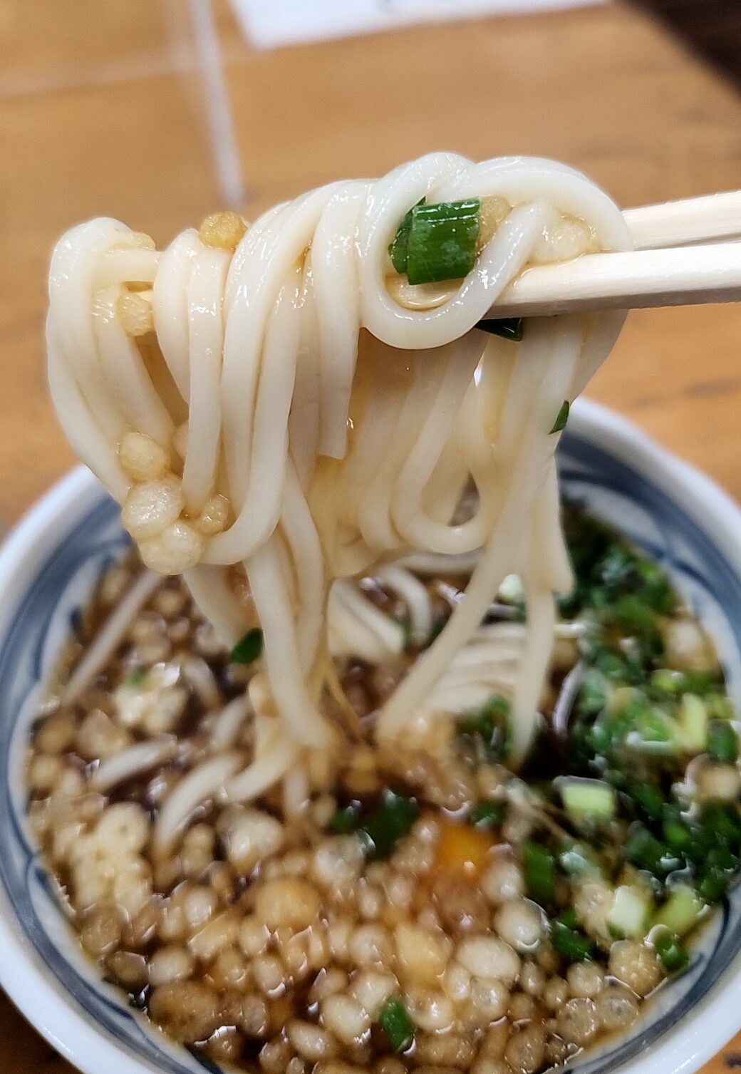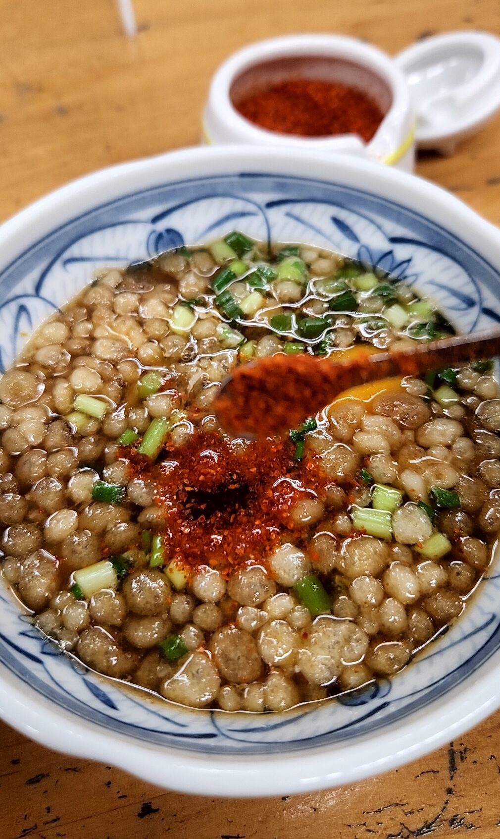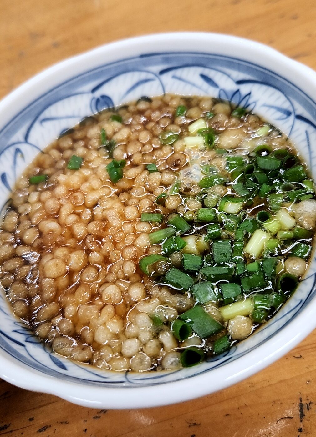 つけダレ。少々甘めのテイスト、鰹風味。これに揚げ玉とネギ、そして玉子が加わる