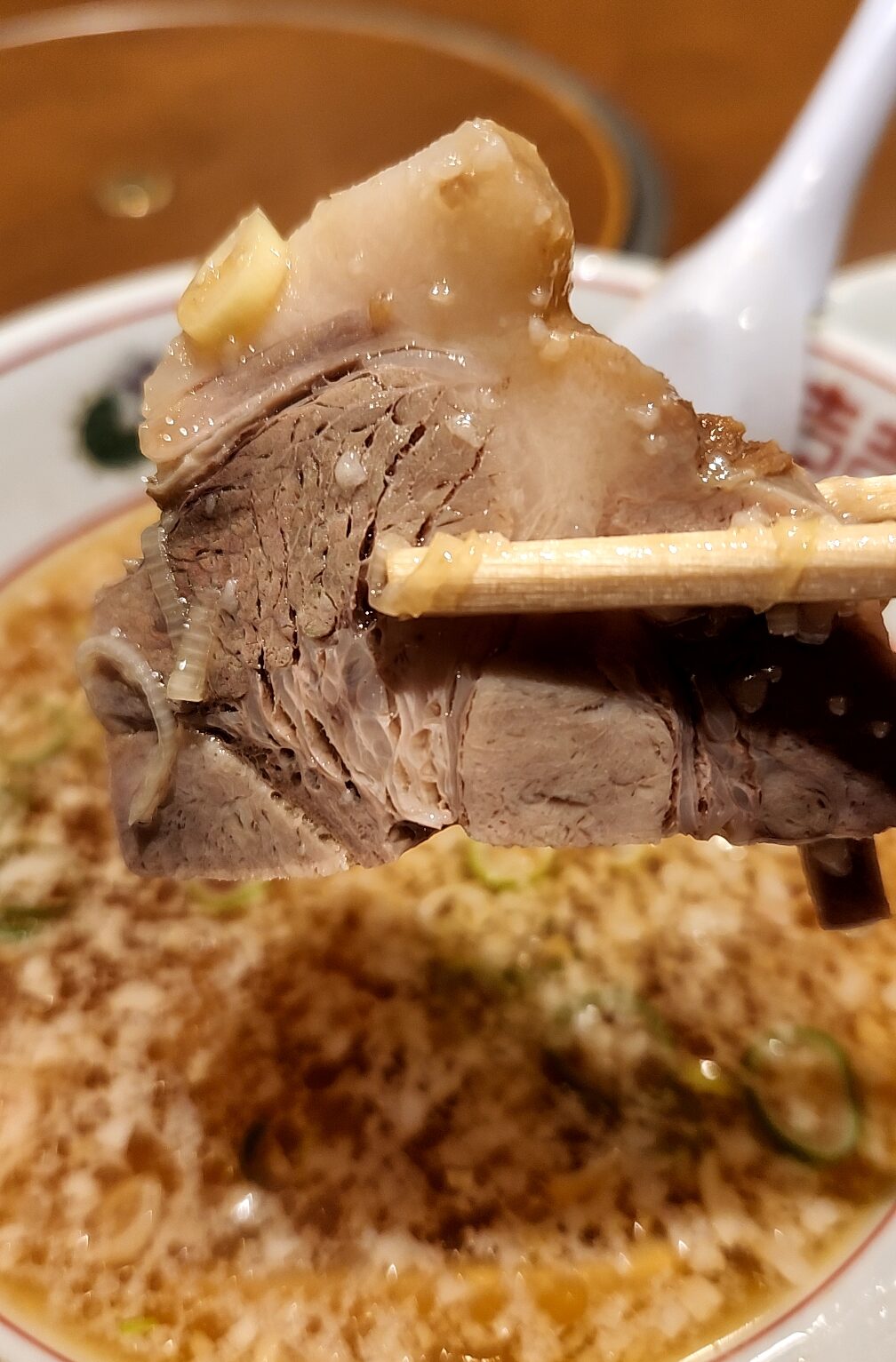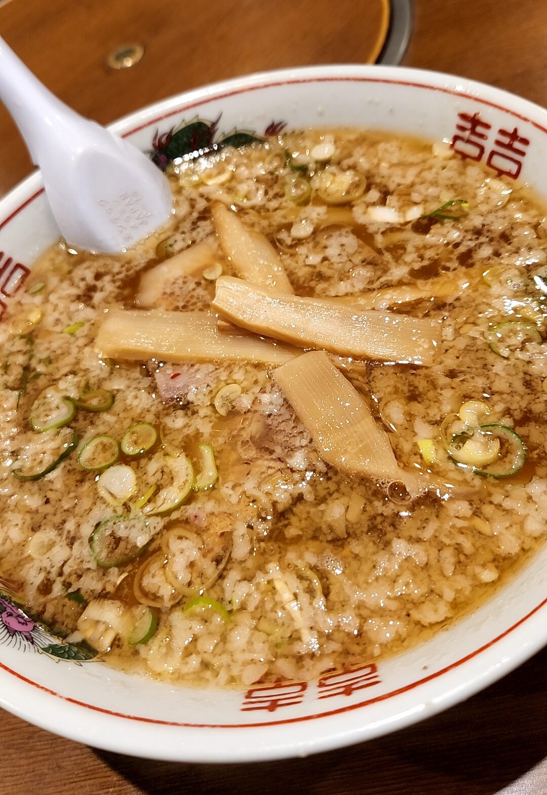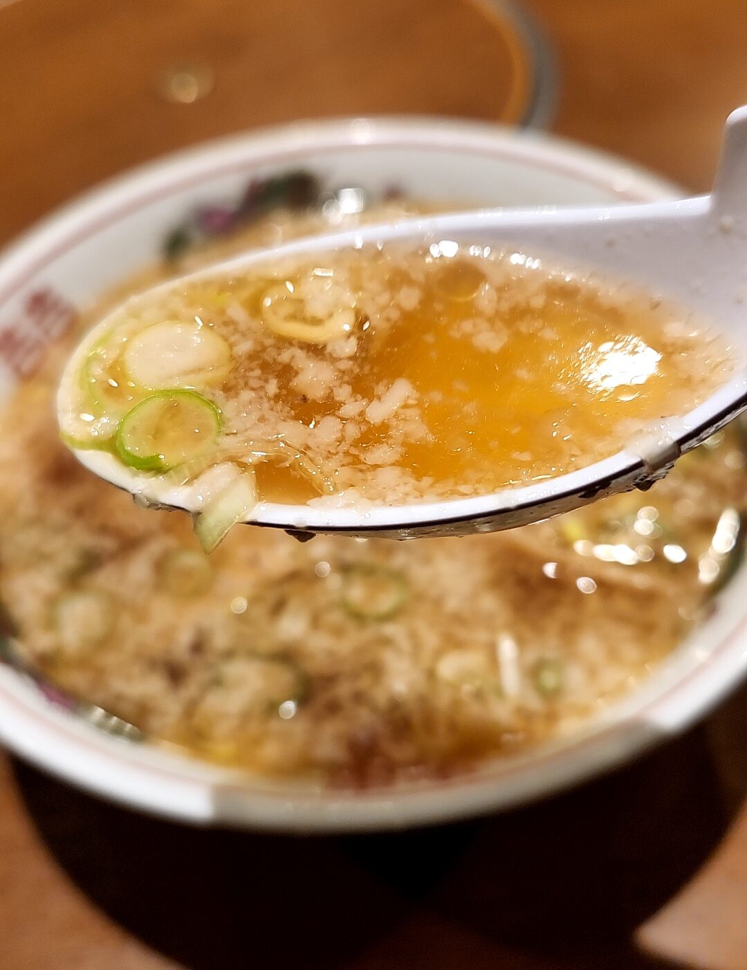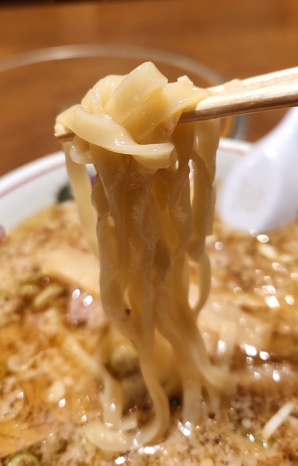 動物系メインのスープ、程よい甘みと旨味を感じられ、これに背脂とネギが丁度よい塩梅