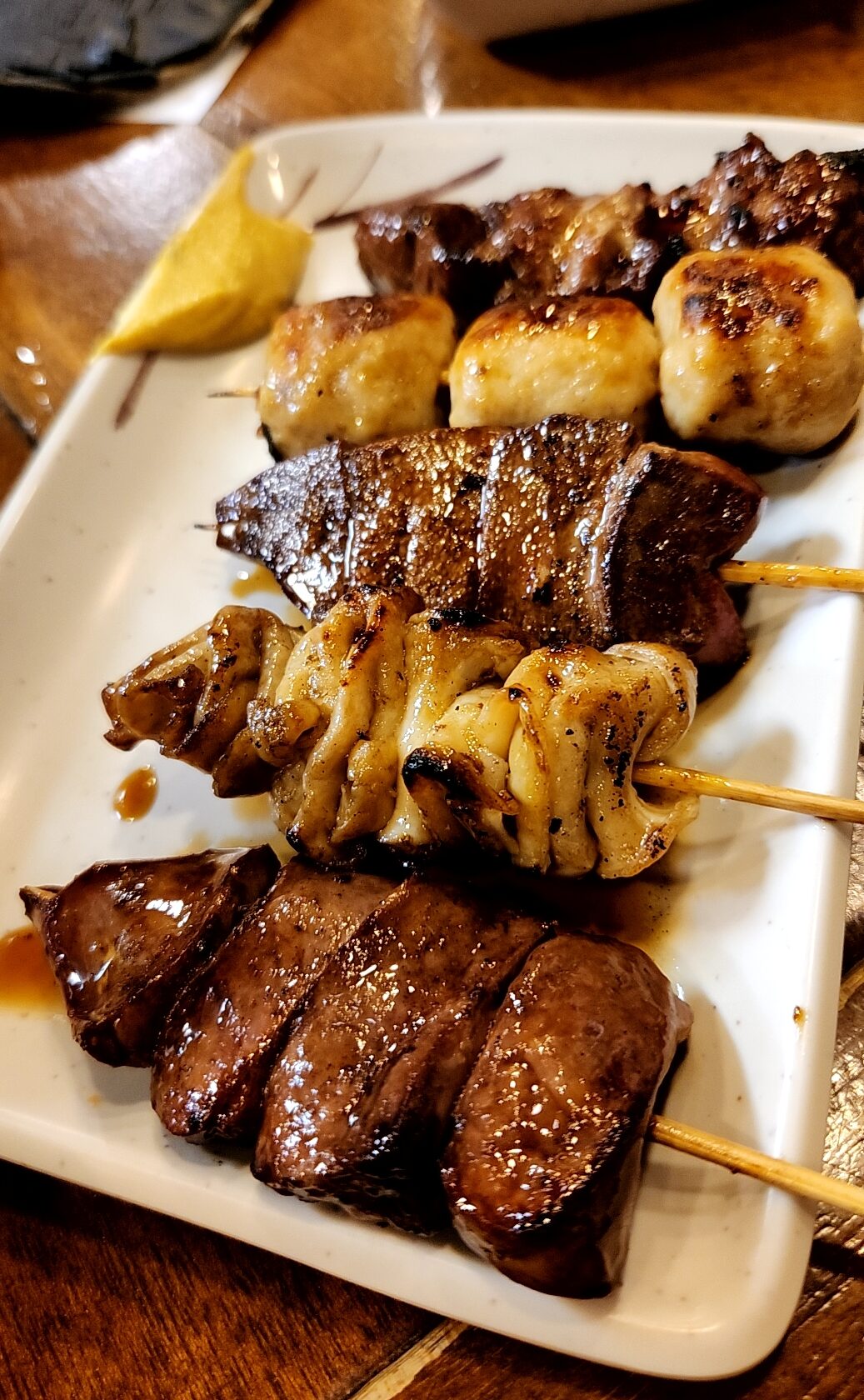 串焼き盛り合わせ、タレで頂く。弾力のあるレバやつくね・シロなど、いずれも食べごたえあり