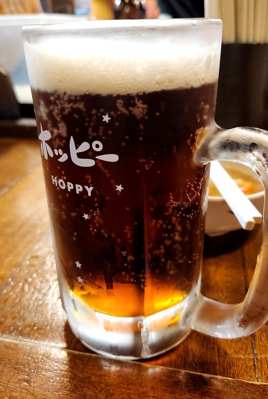 たつやに来たなら絶対頼みたい黒ホッピー。肉厚なもつ焼きとの相性も抜群だ