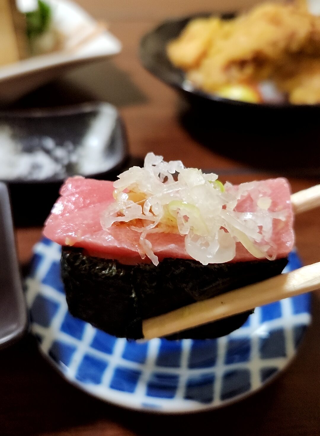 刺身の盛り合わせを頼むとついてくる、軍艦巻き。これに好みの刺身をセルフで乗せて食べる。面白いサービスだ