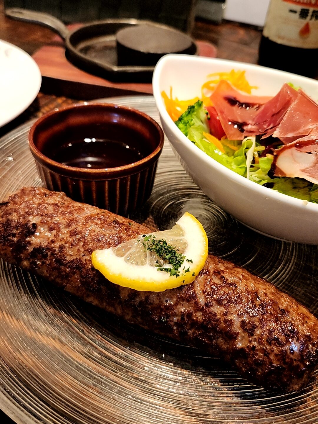 行列店と評判。土曜日の午後3時前、流石に並ばんだろうと思い店に向かう。しかし8組が待っているということで25分待った。凄い人気だな・・・70席あるとのことだが全て埋まっている、ということか。人気は常陸牛のハンバーグで、特殊な調理法で提供。食べる際はセルフでしっかり焼き上げる必要がある。