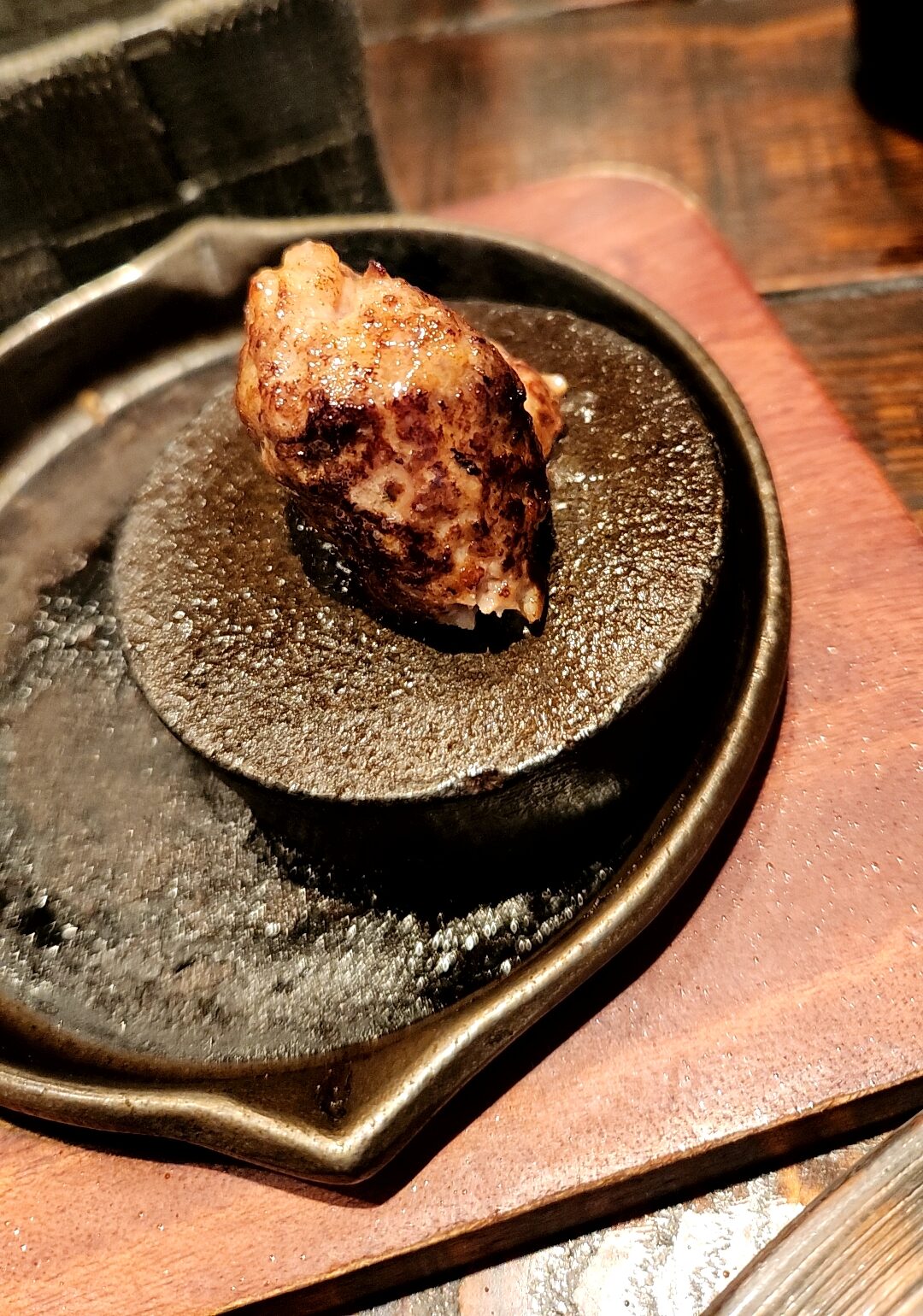 ほぼ生肉なので一口サイズを箸で切り取り必ず焼石で良く焼いて食べるのがルール