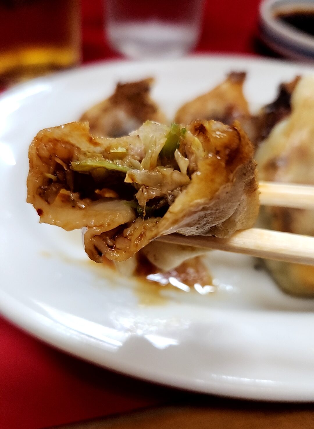この日は土曜の20時半、多くが3名以上の団体につき、30分待った。カウンター14席ほど。ずっとフライパンが稼働中、焼き上げるためのガス台が沢山ある。そういえば、着席しオーダーした途端に餃子が提供された。たまたまタイミングだったのだろうか・・・