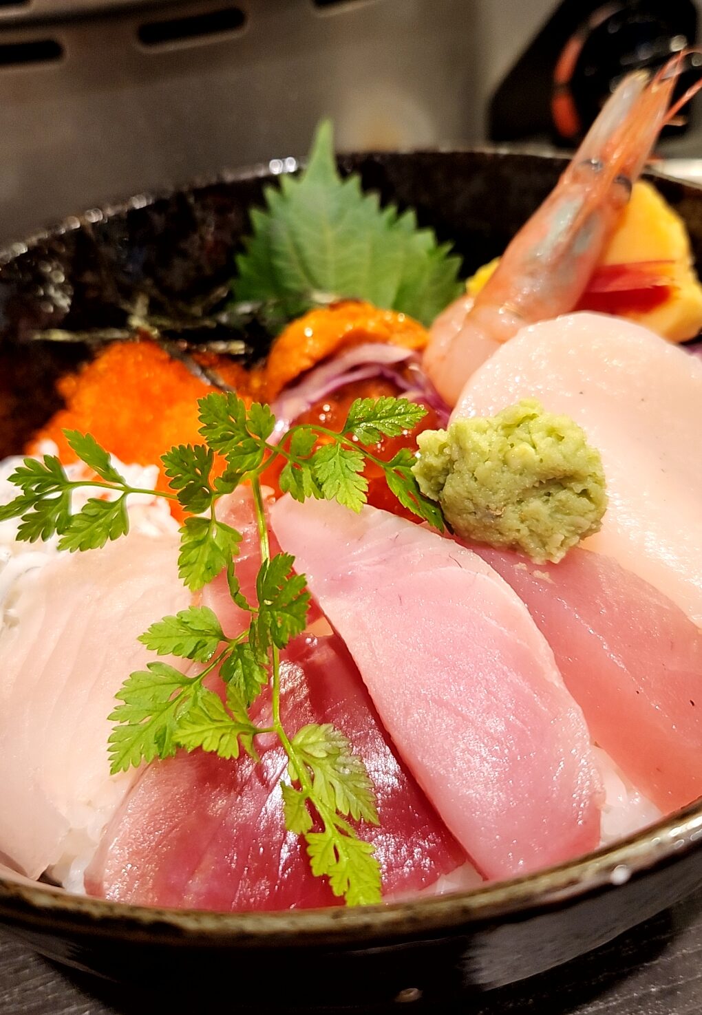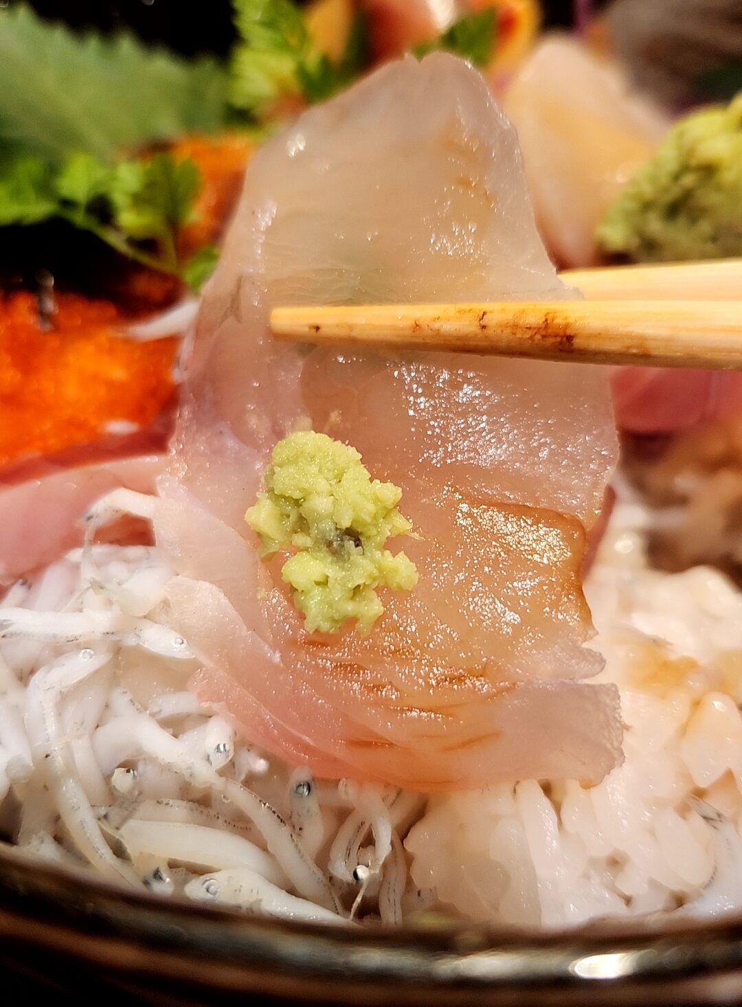 赤身白身のみならずホタテにシラス、海老やウニイクラが入り、かなりのボリューム