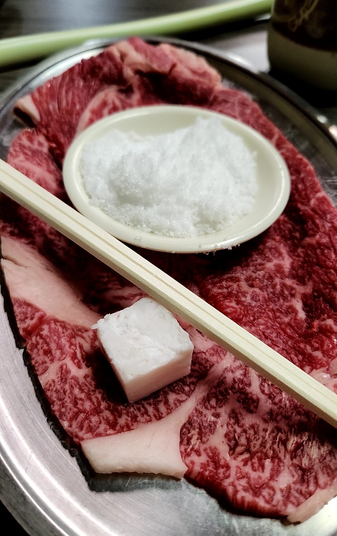 ロースすき焼。中央は砂糖で、ここのすき焼きの味を特徴づける