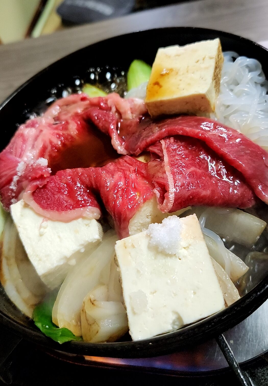 自分で調理するすき焼き。見た目は最高。でもうまく調理できなかった・・・砂糖をたっぷり乗せてタレで頂きます