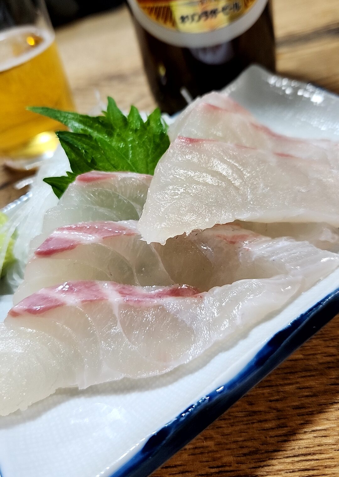 鯛の刺身。平日20時過ぎの到着で売り切れも多数、刺身で唯一残っていたのがこちらだった。身が厚くて歯ごたえも良い
