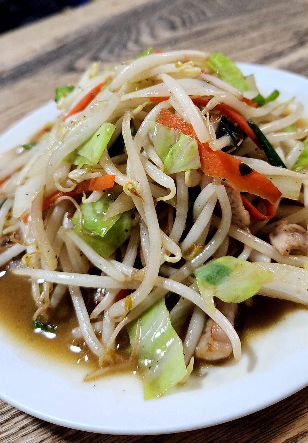 肉野菜炒め。たっぷり盛られていて、塩味がやや強く、シャキシャキとした歯ごたえがたまらない